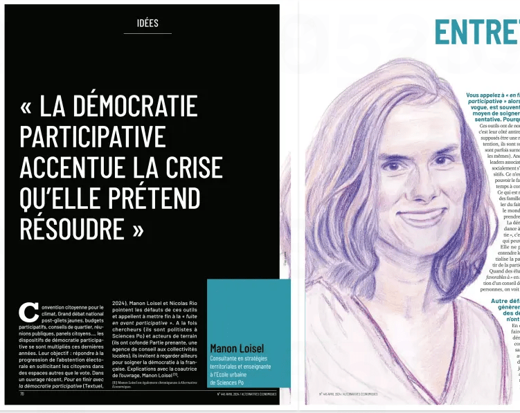 Avril 2024, Manon Loisel, “La démocratie participative accentue la crise qu’elle prétend résoudre”, Alternatives économiques, n°445.