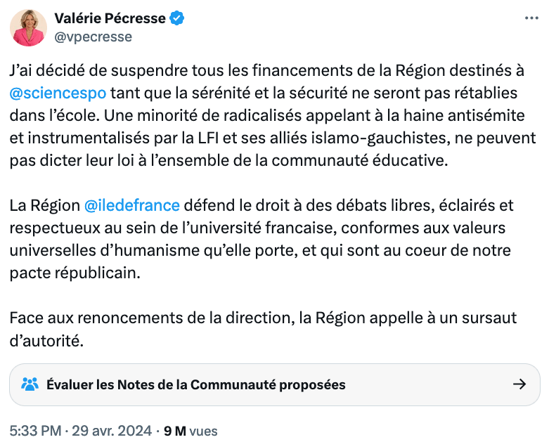 - 29 avril 2024, Mathilde Goanec et Ellen Salvi, « Valérie Pécresse suspend plus d’un million d’euros de subventions à Sciences Po Paris », Médiapart, https://www.mediapart.fr/journal/france/290424/valerie-pecresse-suspend-plus-d-un-million-d-euros-de-subventions-sciences-po-paris ↩︎